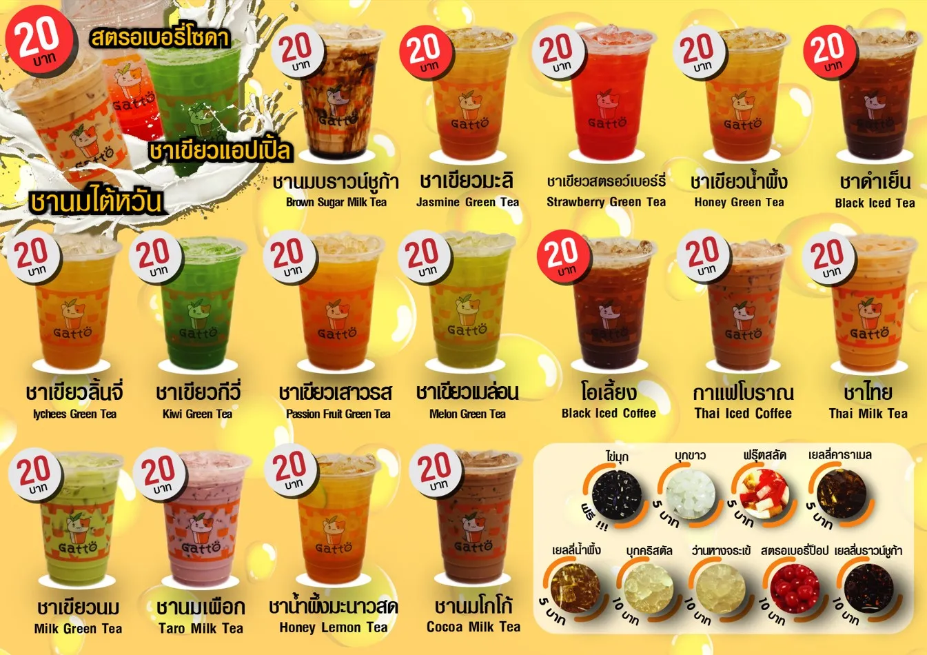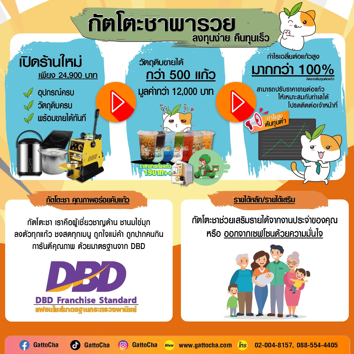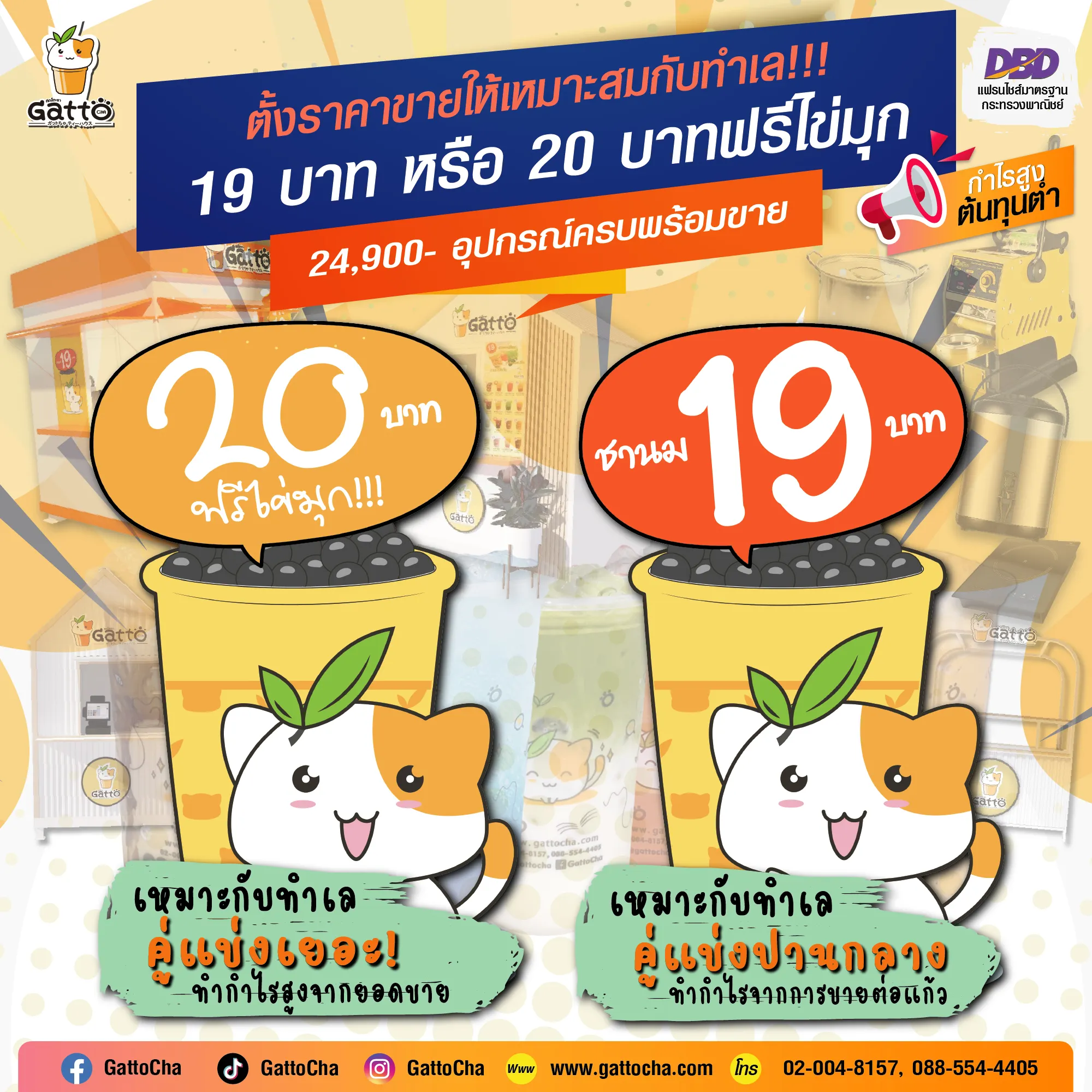 เราเชื่อว่าของอร่อยไม่จำเป็นต้องจ่ายแพง หัวใจสำคัญที่ทำให้ GattoCha เป็นที่รักของลูกค้าคือ ทุกเมนูของเรา “ต้มสด ชงสด” แก้วต่อแก้ว ใช้วัตถุดิบคุณภาพพรีเมียม แต่จำหน่ายในราคาที่น่ารักจับต้องได้ เริ่มต้นเพียง 20.- ถึง 40.- บาทเท่านั้น ทำให้ลูกค้าตัดสินใจซื้อง่าย กลับมาซื้อซ้ำได้บ่อย และนั่นคือประตูสู่รายได้ที่มั่นคงของคุณ